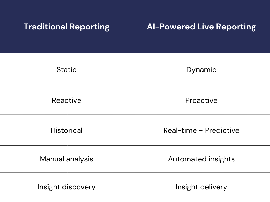 AI-powered reporting is not just faster - it is fundamentally smarter. It operates as a continuous intelligence system.