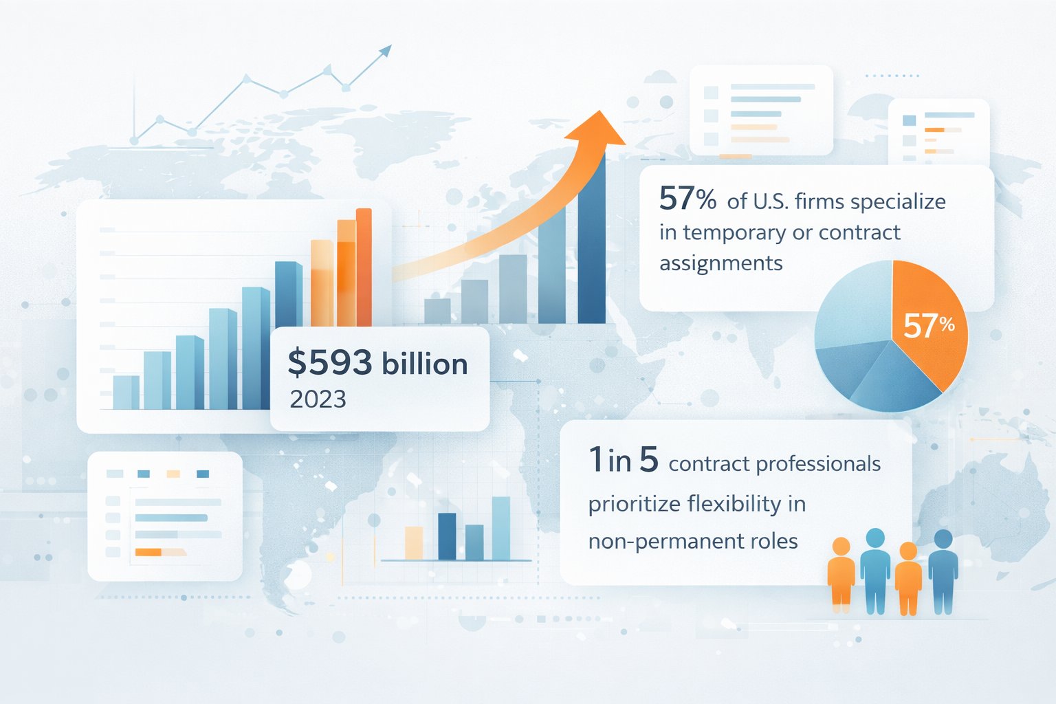 57% of U.S. firms now specialize in temporary or contract assignments, highlighting strong demand for on-demand expertise.